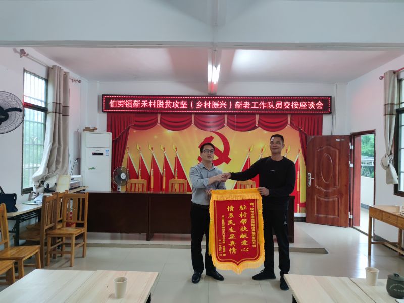 一、2021年4月25日,集團公司與市民政局、市退役軍人局、大成鎮黨委領導和新派駐工作隊員一同抵達浦北縣大成鎮聯成村,召開了浦北縣大成鎮聯成村鄉村振興座談會,座談會上對老一屆工作隊周榮正等同志的辛勤付出和成績給予了高度肯定,對新一屆工作隊梁家強等同志的到來表示歡迎。座談會結束后,進行了新舊工作隊交接儀式。