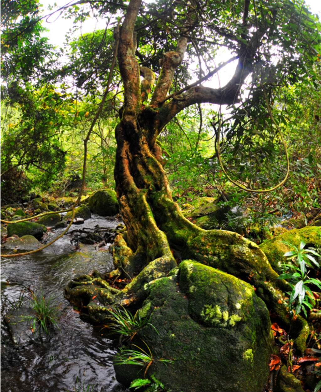 山中到處是淙淙溪流,溪水清瀅碧透,游魚可數。溪旁綠樹成蔭,遮天蔽日。