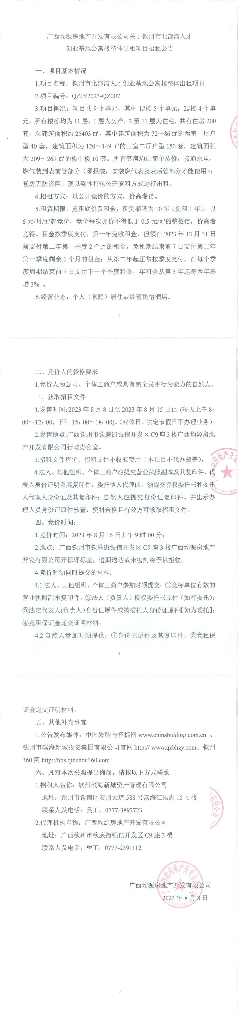 欽州市北部灣人才創業基地公寓樓整體出租項目招租公告