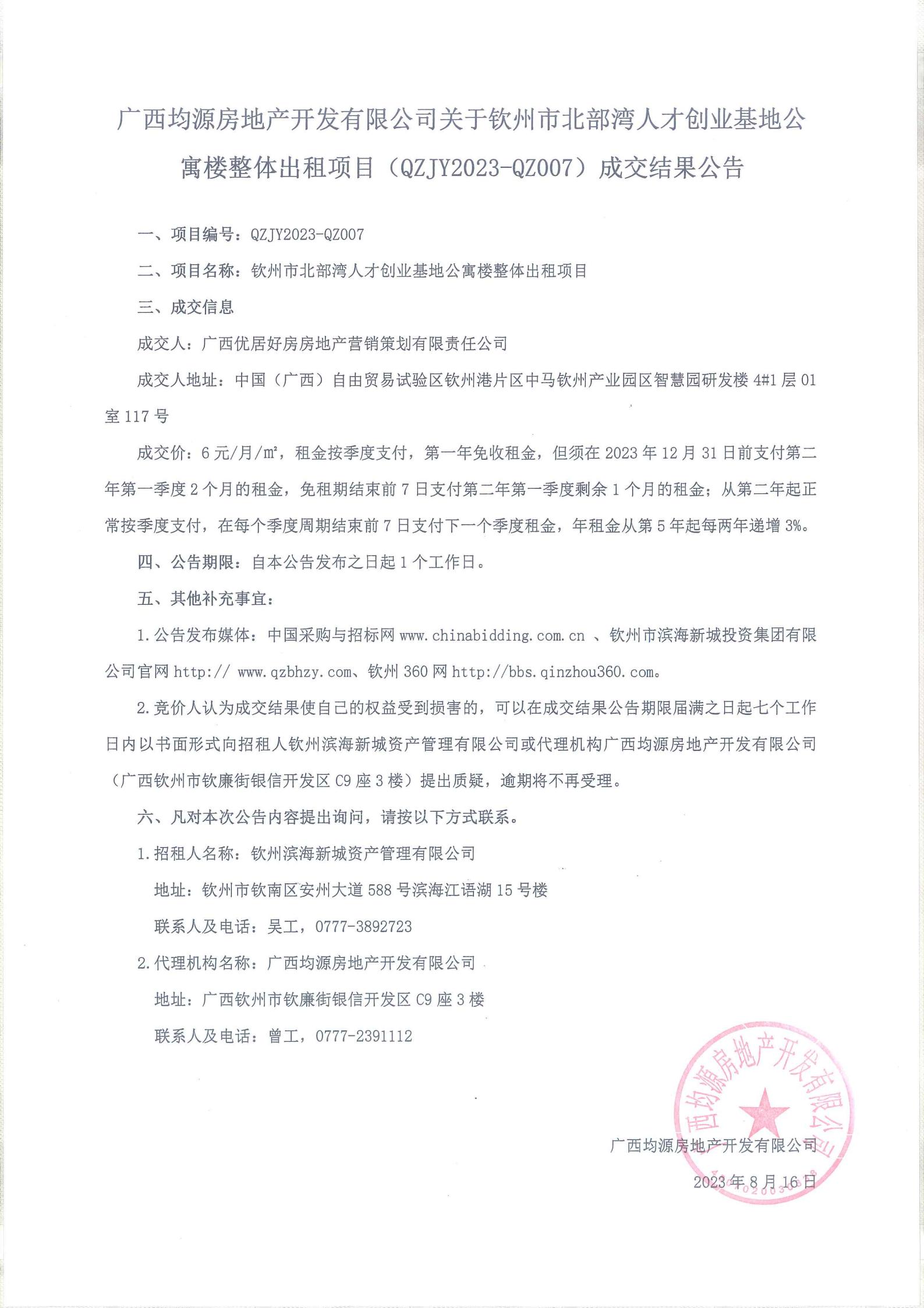 關于欽州市北部灣人才創業基地公寓樓整體出租項目成交結果公告