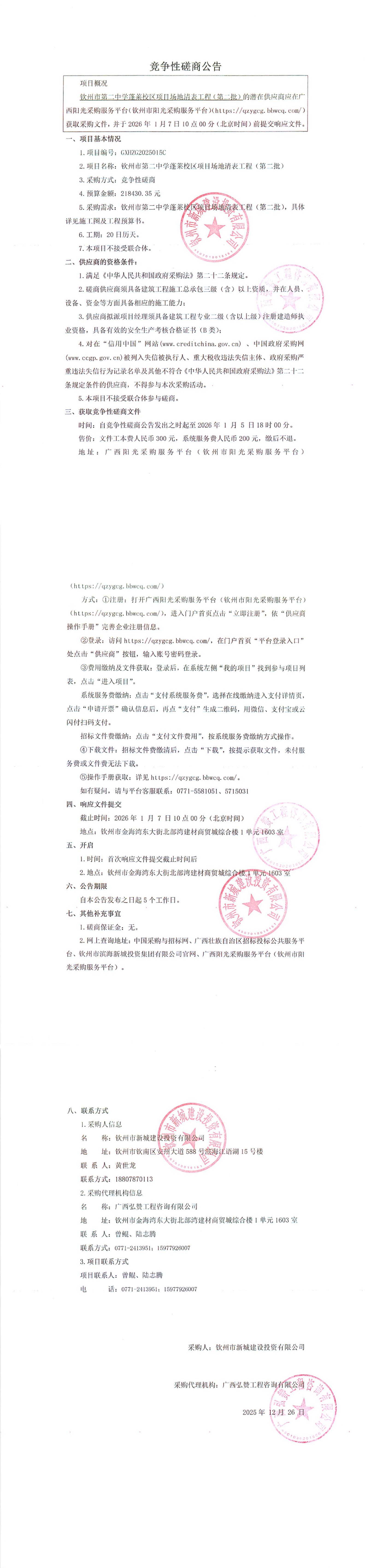 競爭性磋商公告(欽州市第二中學(xué)蓬萊校區(qū)項目場地清表工程(第二批))