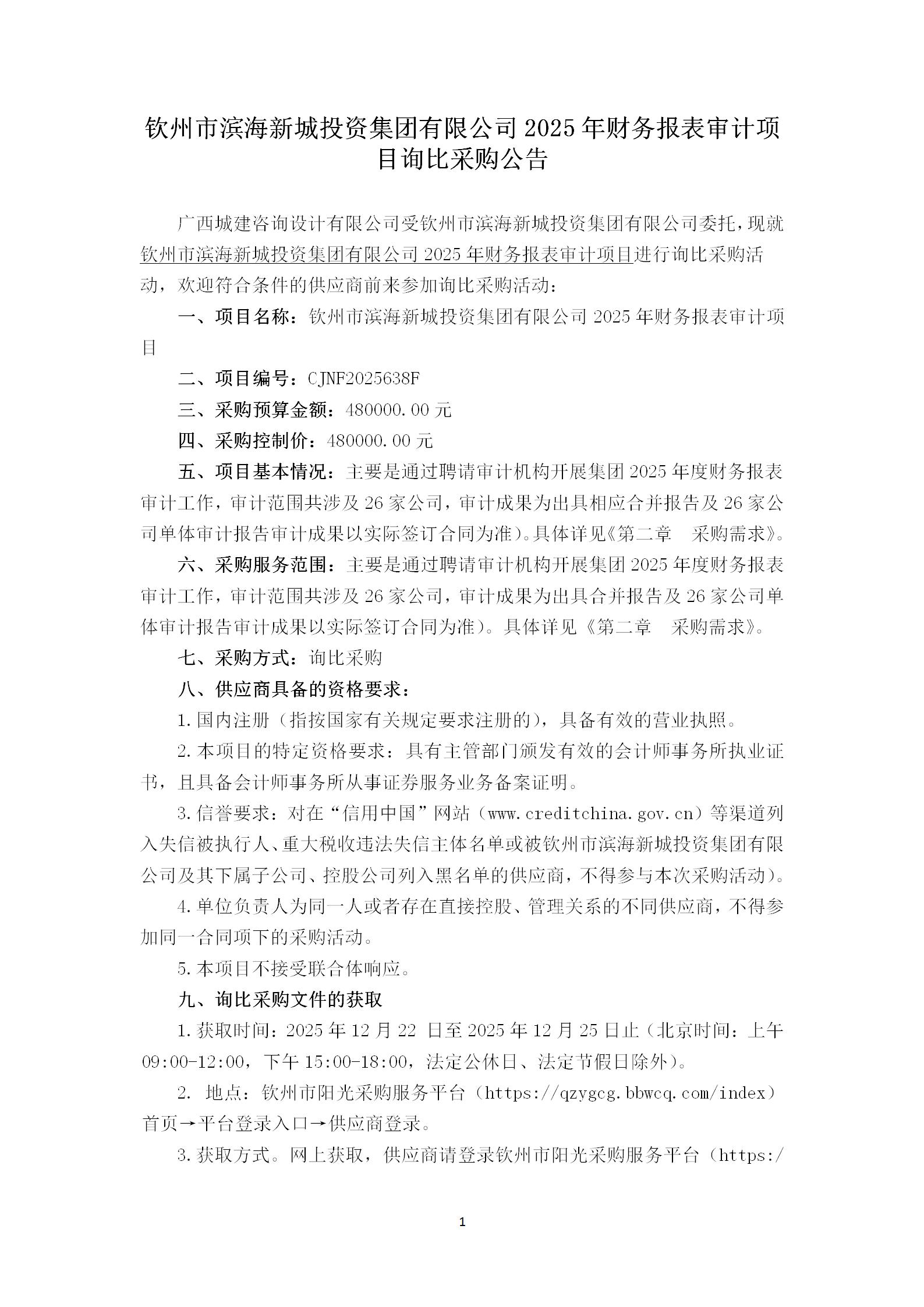 欽州市濱海新城投資集團有限公司2025年財務(wù)報表審計項目詢比采購公告