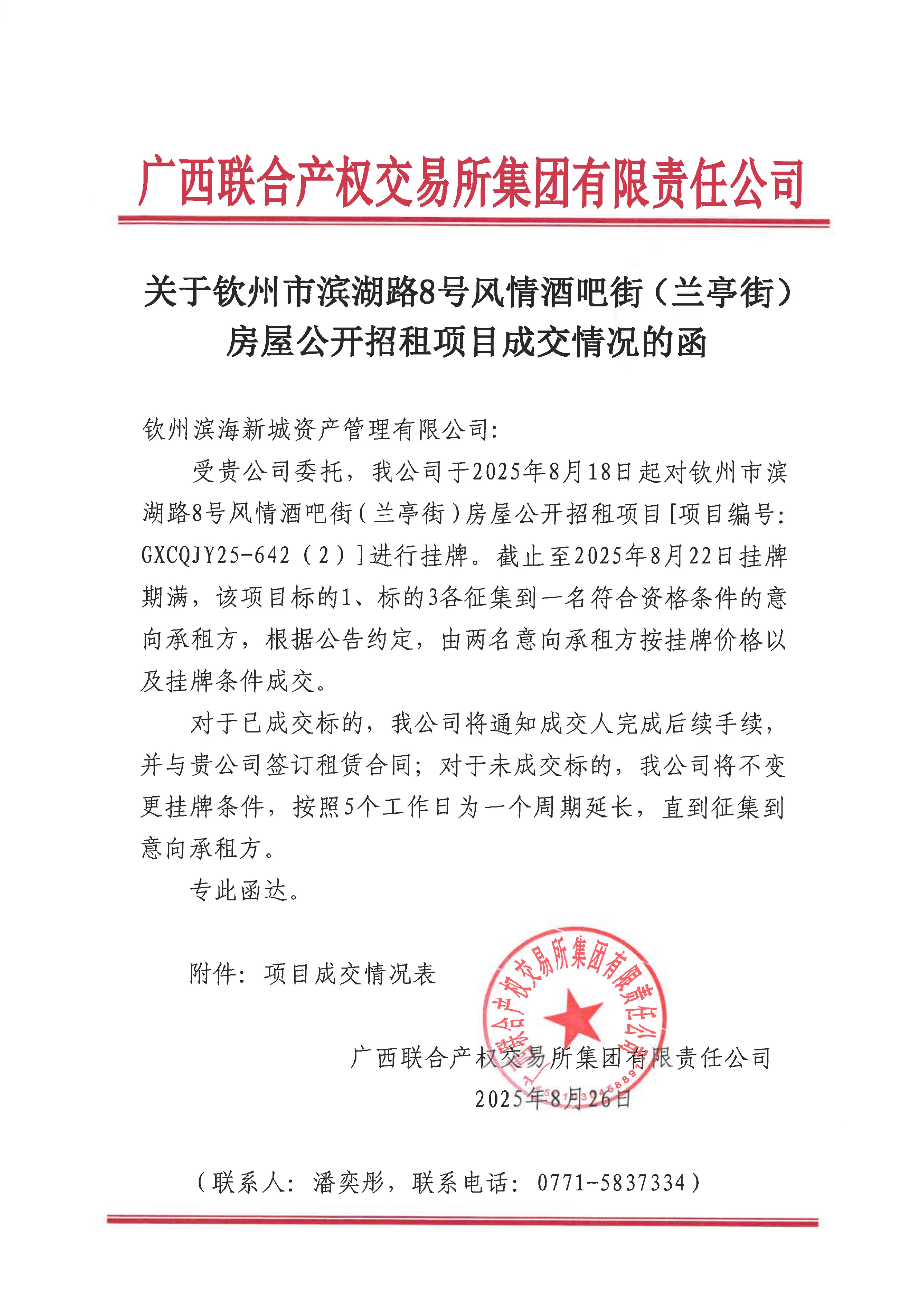 關于欽州市濱湖路8號風情酒吧街(蘭亭街)房屋公開招租項目成交情況的函(...