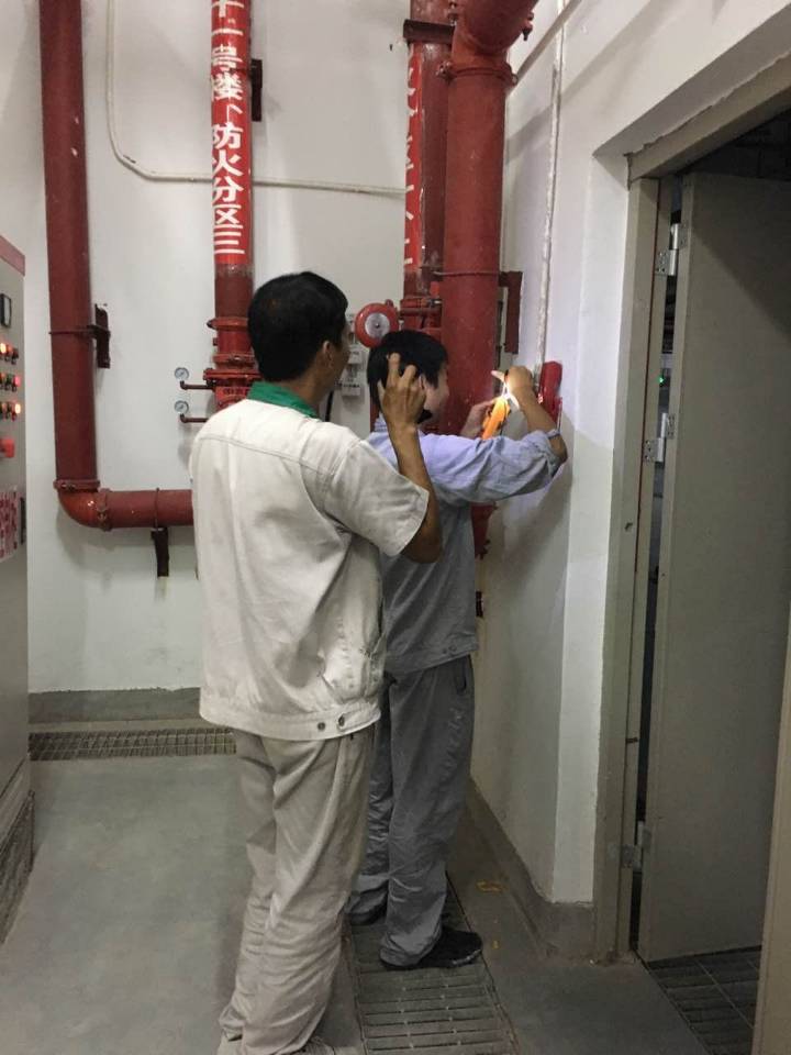 圖為消防維保單位及物業(yè)工程人員在進(jìn)行現(xiàn)場消防設(shè)施檢查
