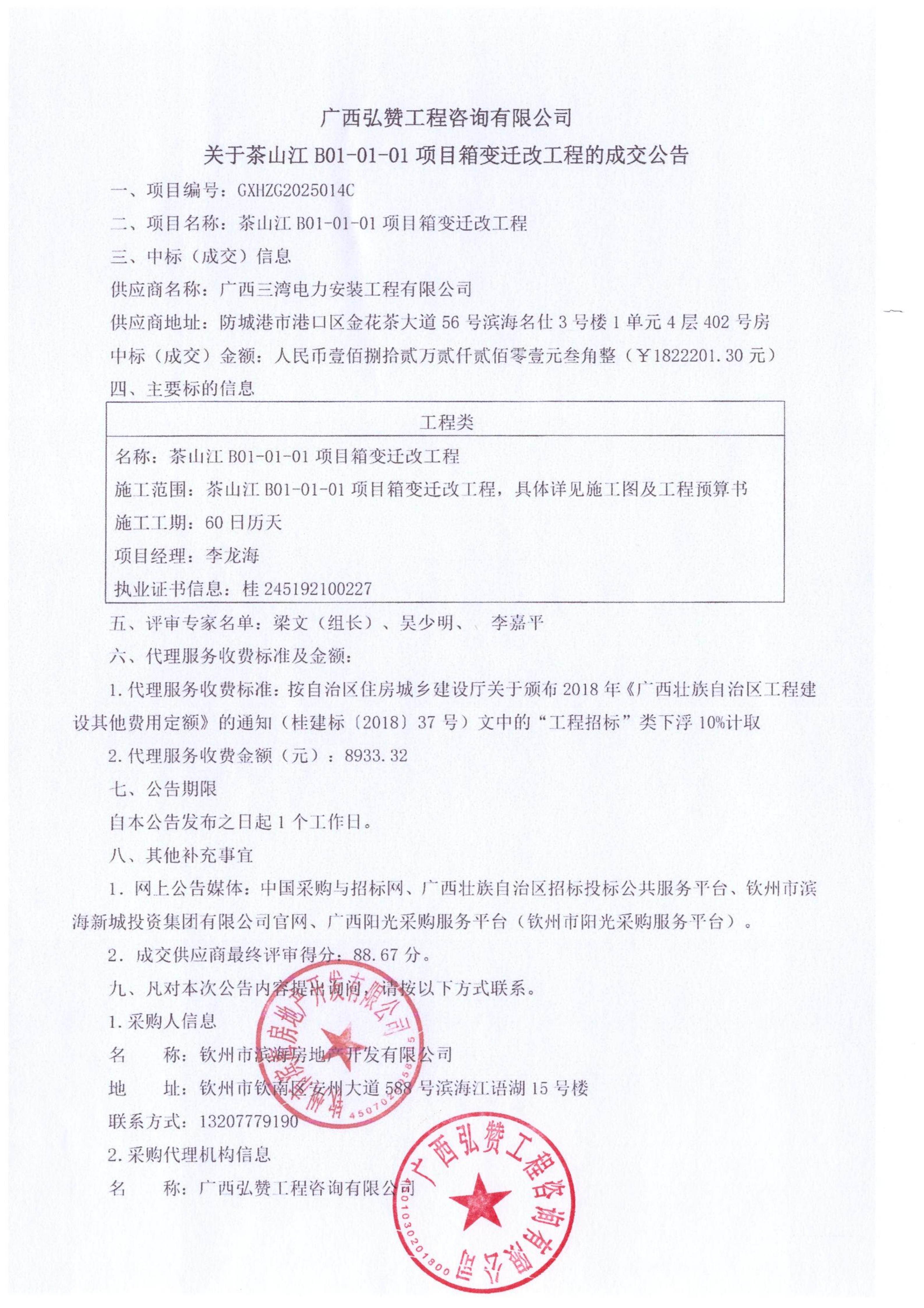 茶山江B01-01-01項目箱變遷改工程成交公告