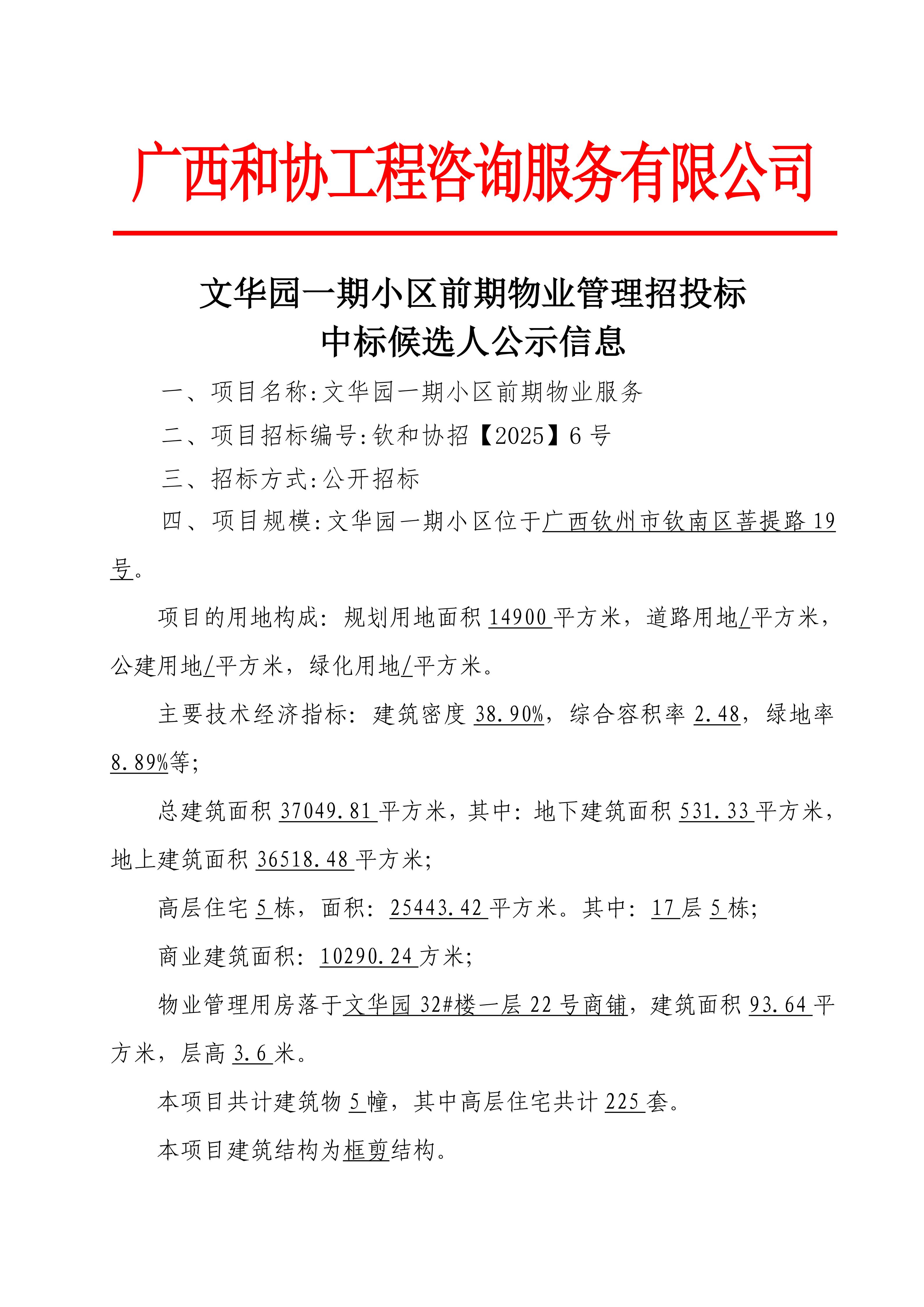 文華園一期小區前期物業管理招投標中標候選人公示信息