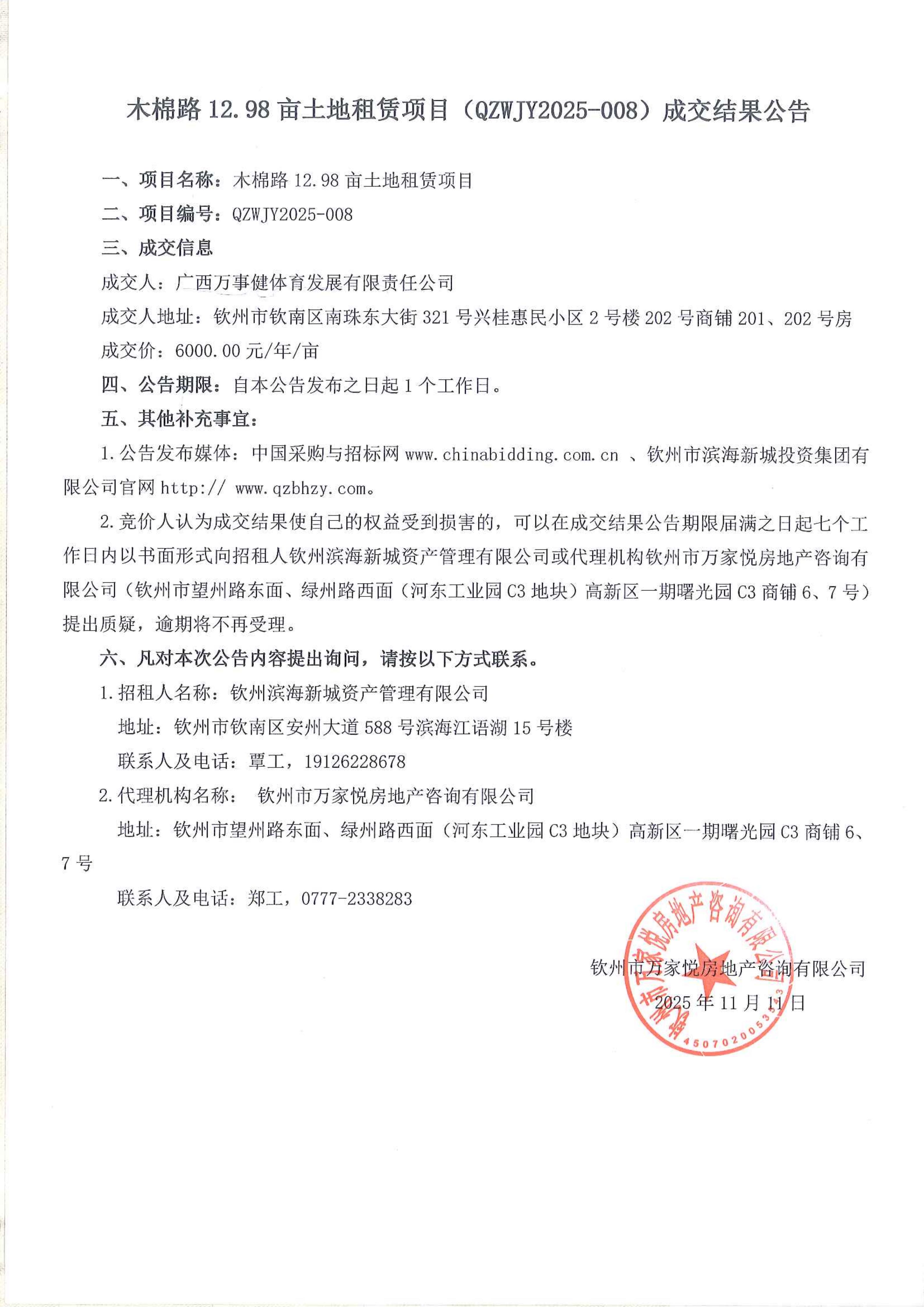 木棉路12.98畝土地租賃項目(QZWJY2025-008)成交結果公...