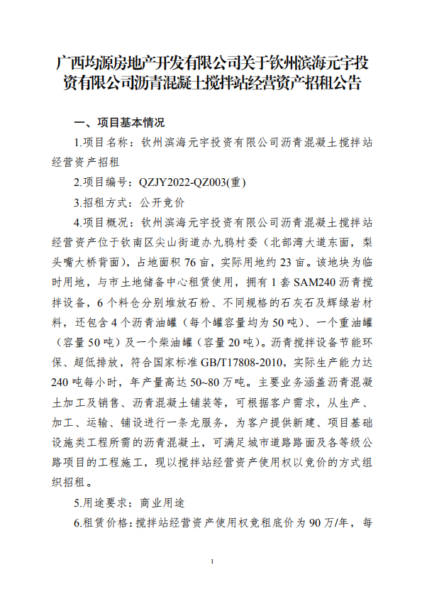 廣西均源房地產(chǎn)開發(fā)有限公司關(guān)于欽州濱海元宇投資有限公司瀝青混凝土攪拌站經(jīng)營資產(chǎn)招租公告