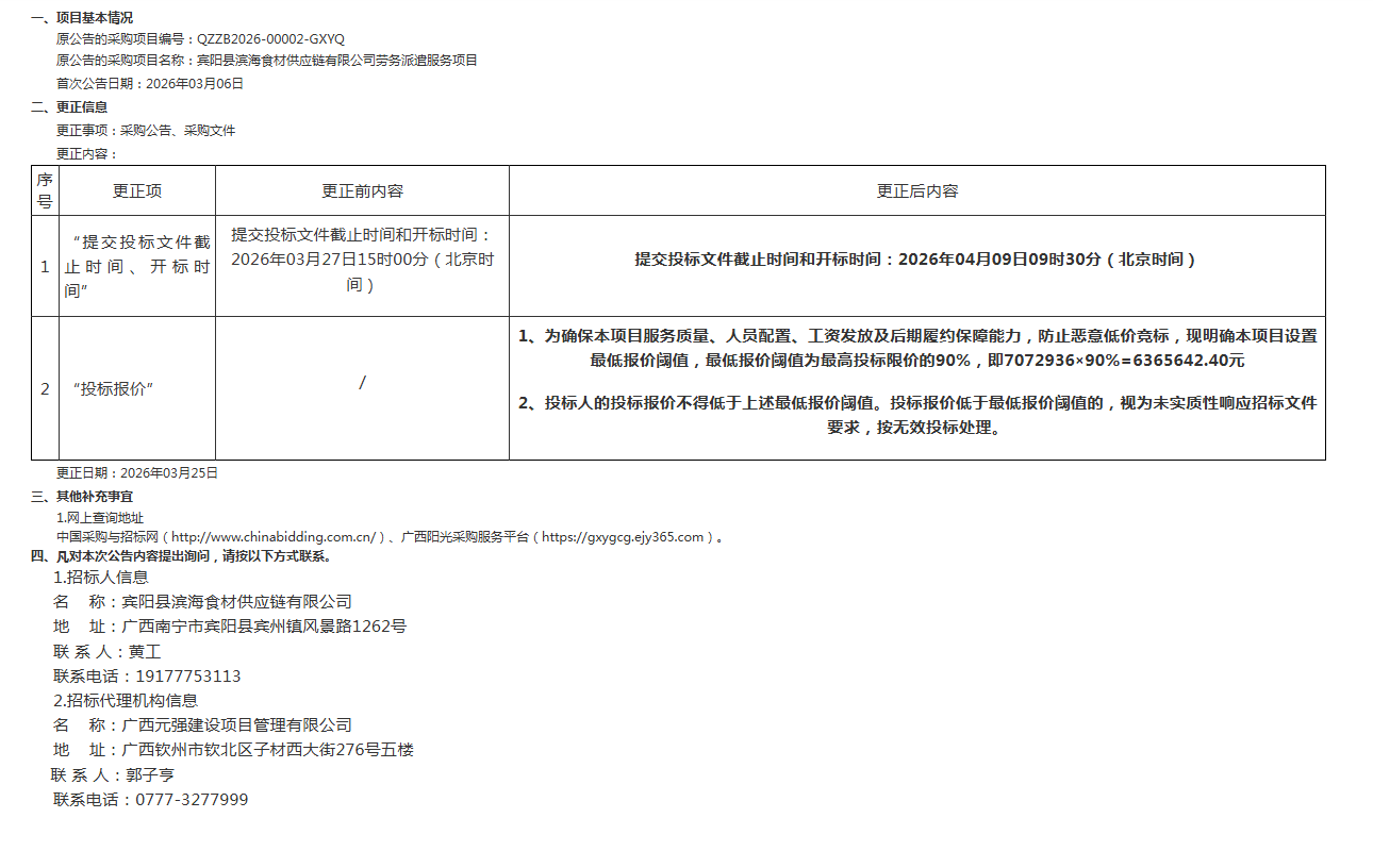 廣西元強建設項目管理有限公司關于賓陽縣濱海食材供應鏈有限公司勞務派遣服務項目的更正公告(二)