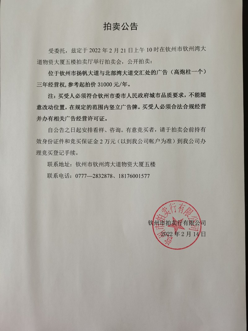 拍賣(mài)公告(揚(yáng)帆大道與北部灣大道交匯處廣告經(jīng)營(yíng)權(quán))