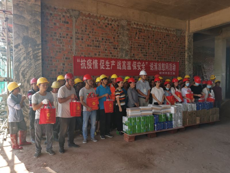 7月13日,欽州市總工會調研員黃春雯等一行到我集團公司負責建設的欽州是茅尾海監控監測管理基地項目現場,開展“抗疫情 促生產 戰高溫”送清涼慰問活動。在炎炎夏日,為現場辛勤勞作的農民工獻上一份清涼。致謝每一位在一線工作的人員,感謝他們為我們城市發展貢獻一份力量。