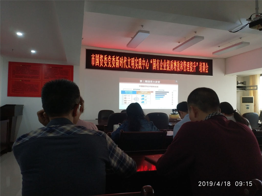 4 月 18 日 上 午 9:00 , 在 市 國 資 委 1220 會 議 室 舉 行 了 第 三期國資大講壇視頻會議, 會議主題為國有企業提質增效管 理和提升。