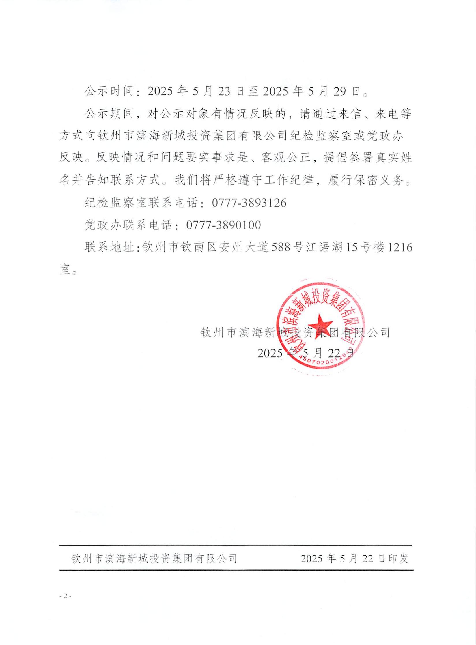 欽州市濱海新城投資集團有限公司2025年公開招聘工作人員擬聘用人選公示