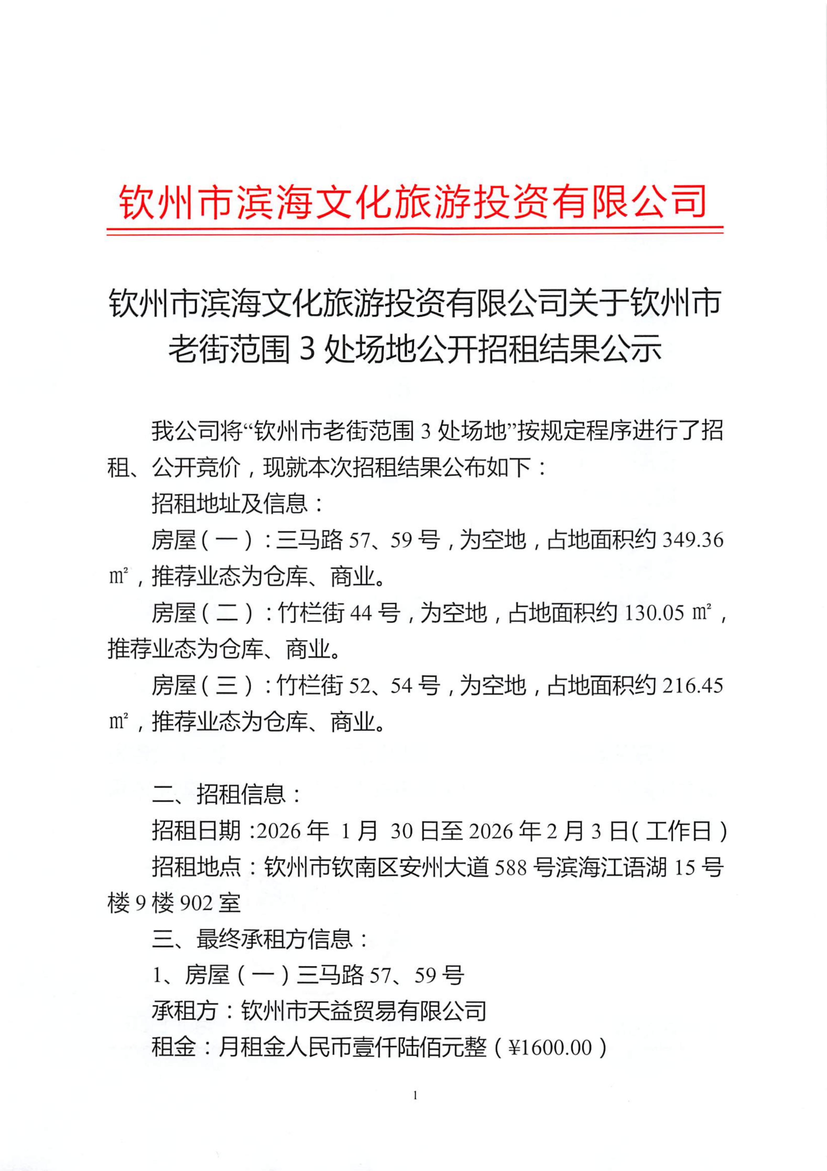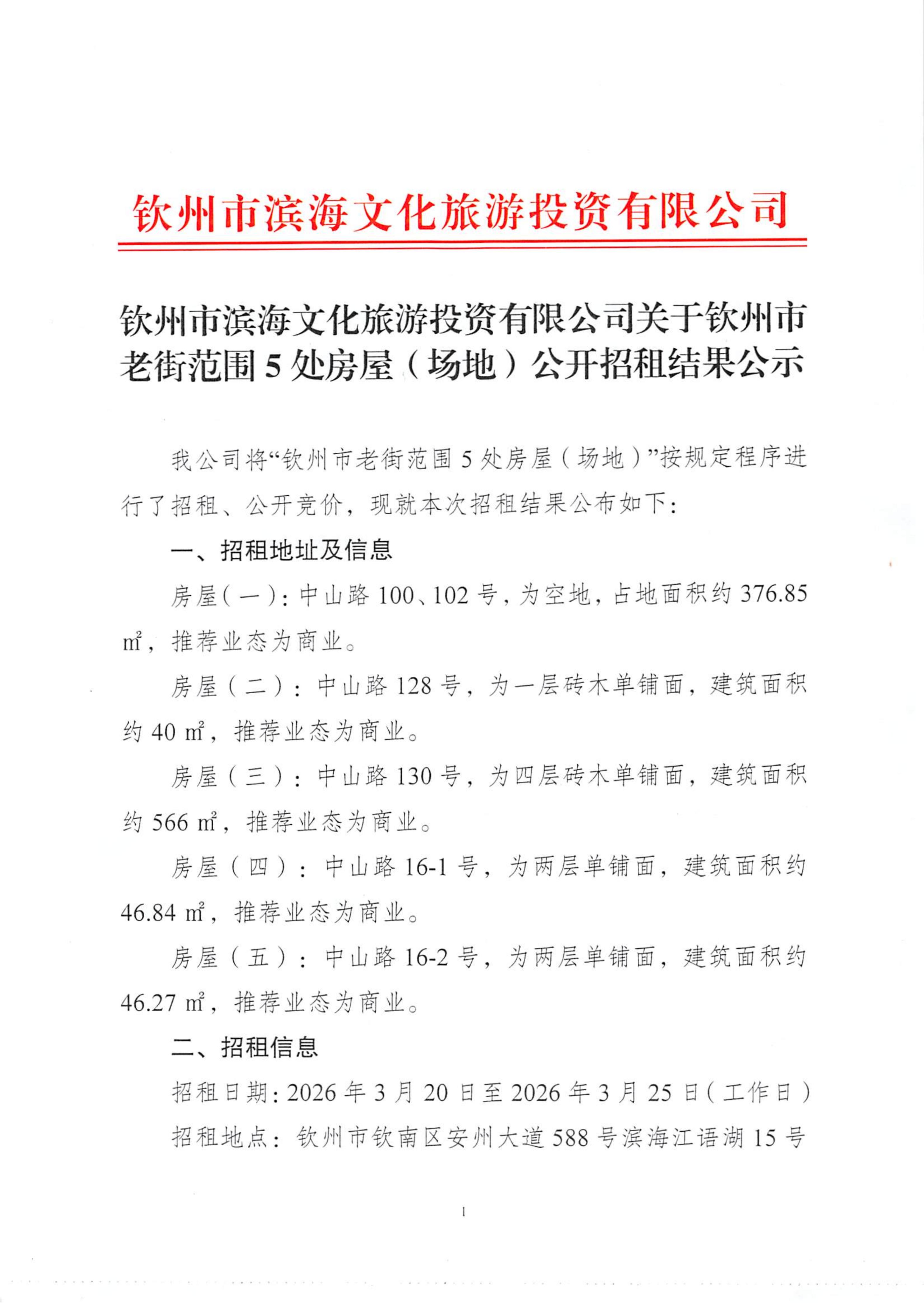 欽州市濱海文化旅游投資有限公司關于欽州市老街范圍5處房屋(場地)公開招租結果公示