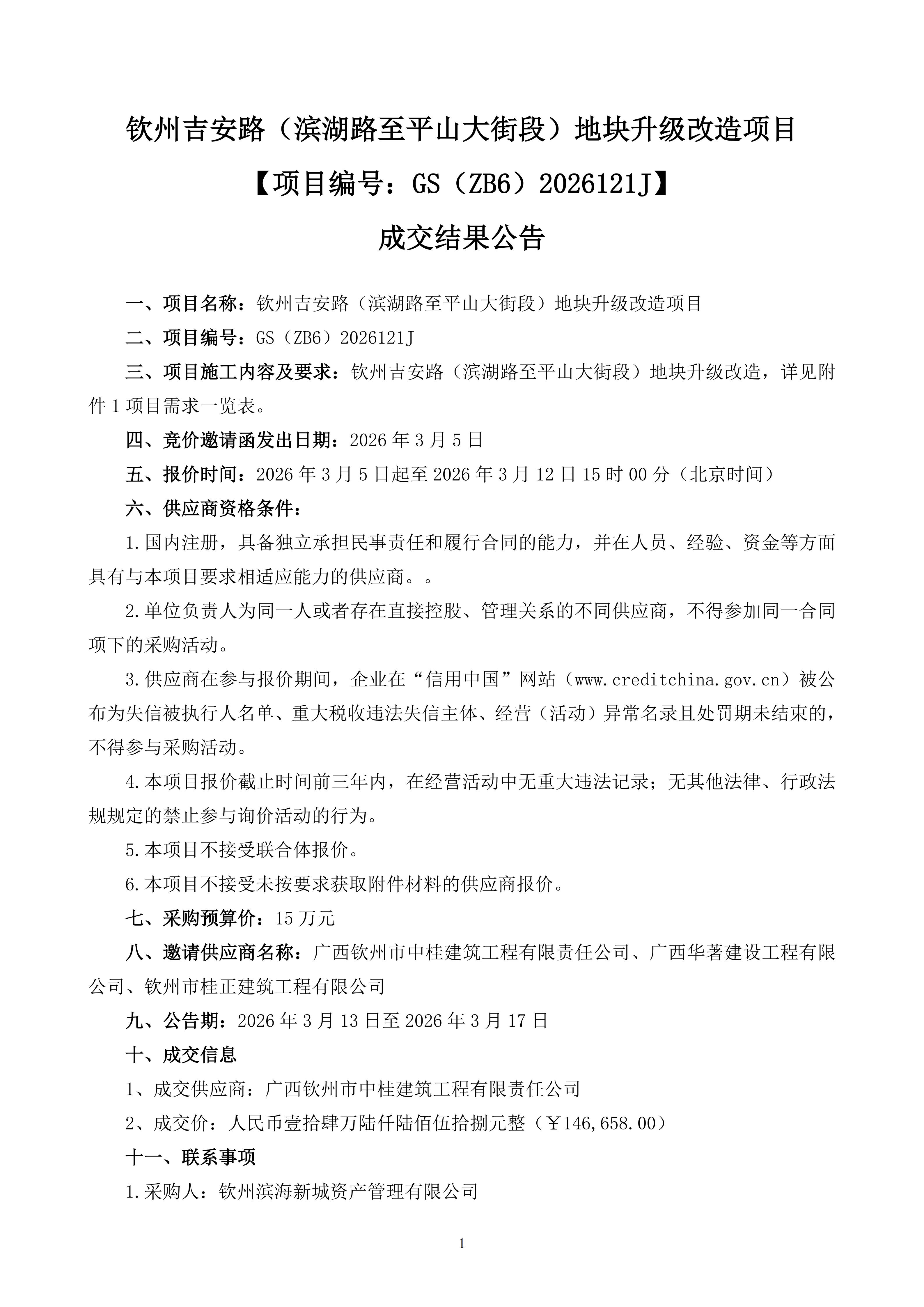 欽州吉安路(濱湖路至平山大街段)地塊升級改造項目 【項目編號:GS(ZB6)2026121J】 成交結果公告