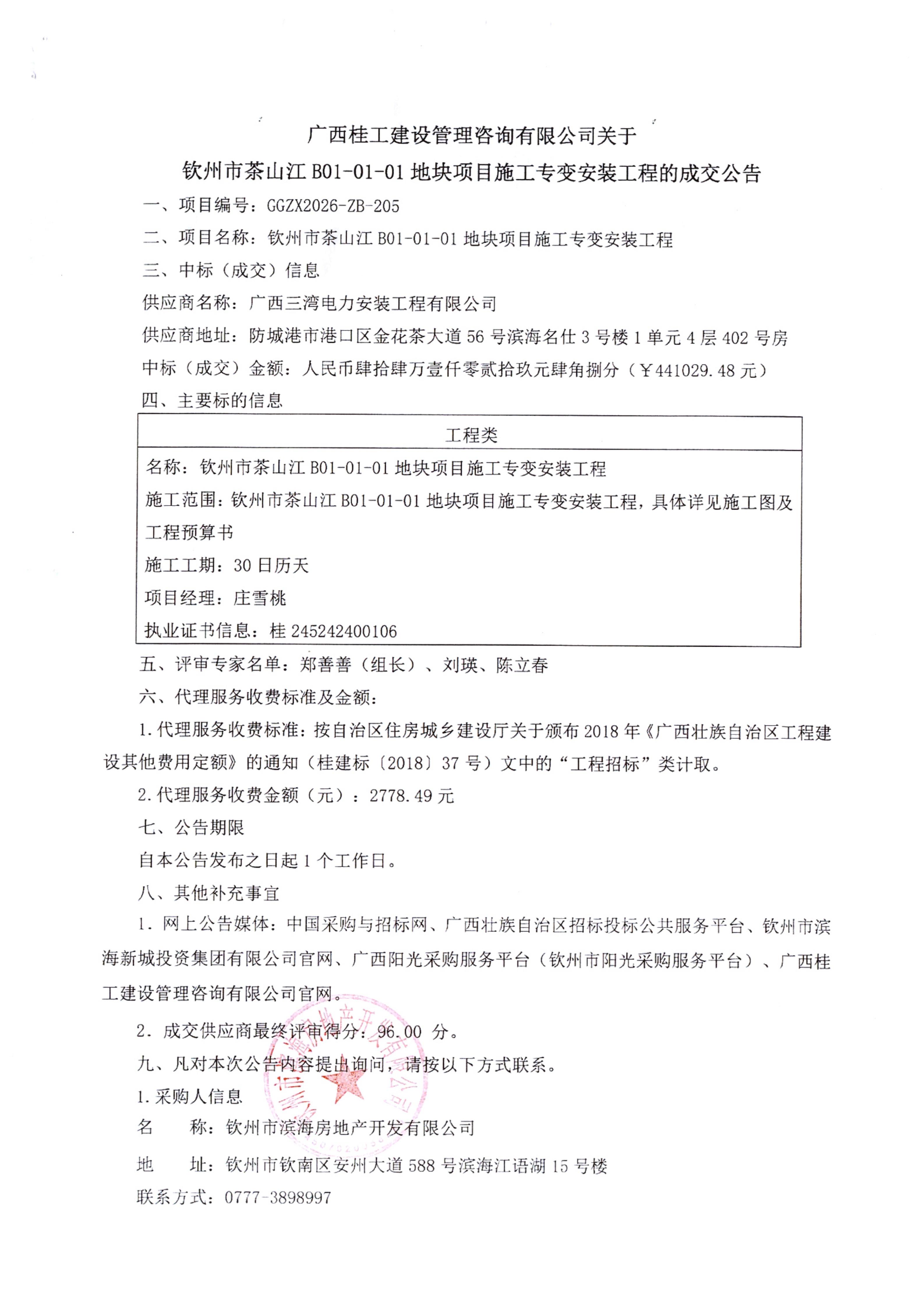 欽州市茶山江B01-01-01地塊項目施工專變安裝工程成交公告
