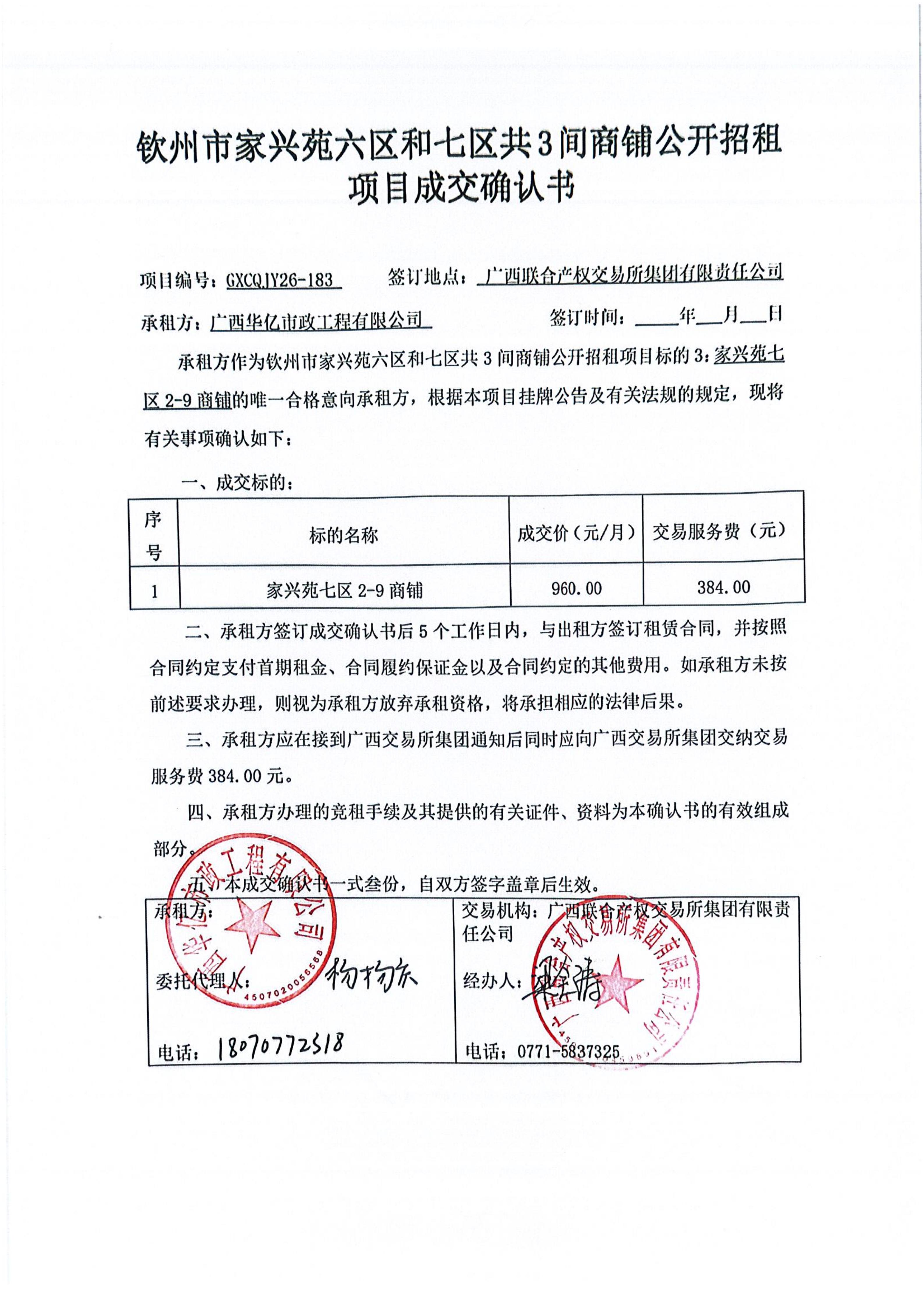欽州市家興苑六區(qū)和七區(qū)共3間商鋪公開招租項目成交確認書