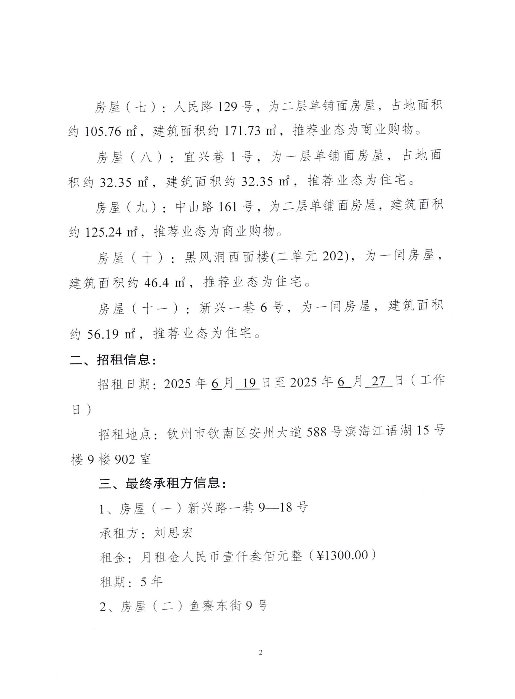欽州市濱海文化旅游投資有限公司關于欽州市老街范圍11處房屋(場地)公開招租結果公示
