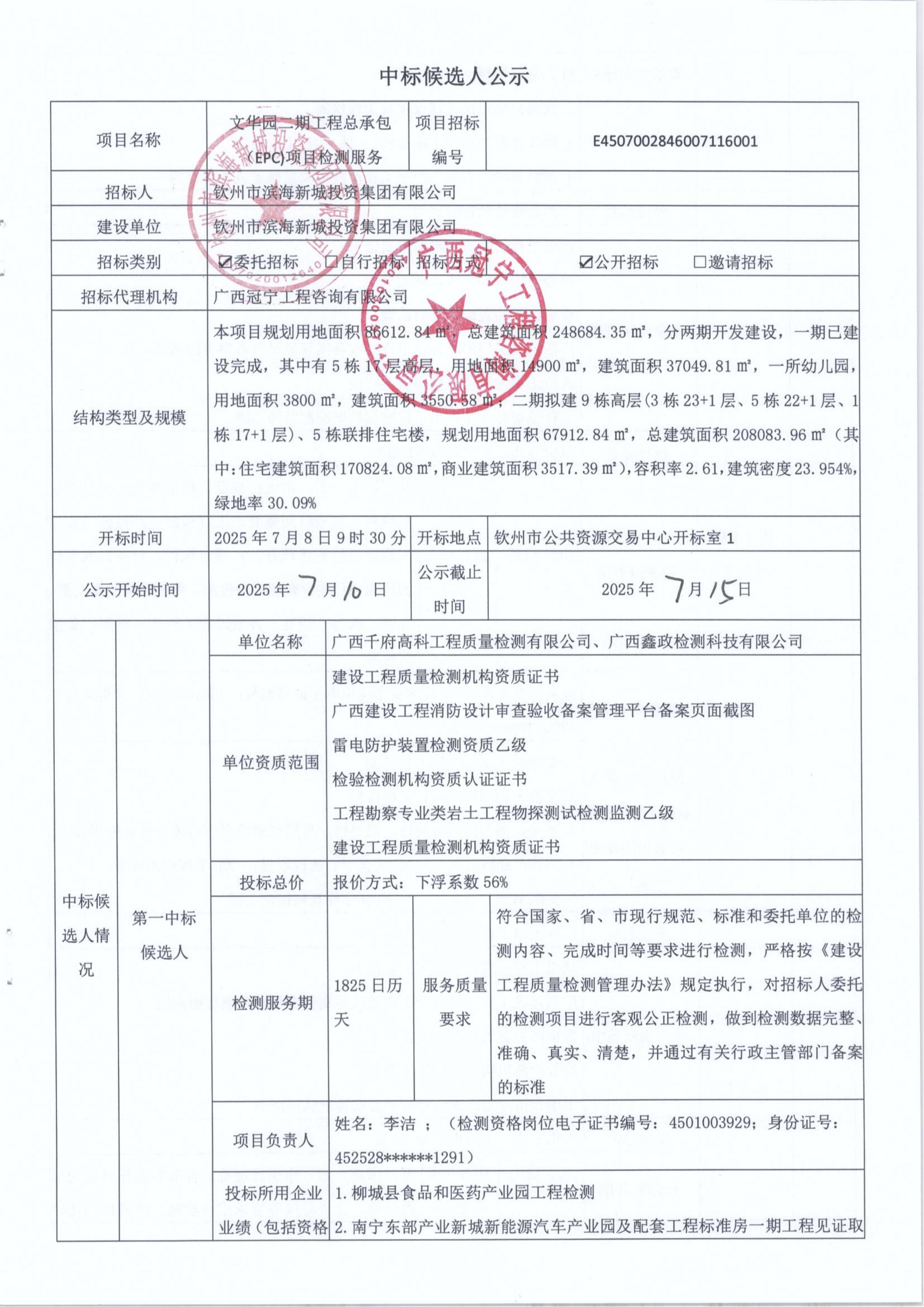 文華園二期工程總承包(EPC)項目檢測服務工程檢測招標中標候選人公示