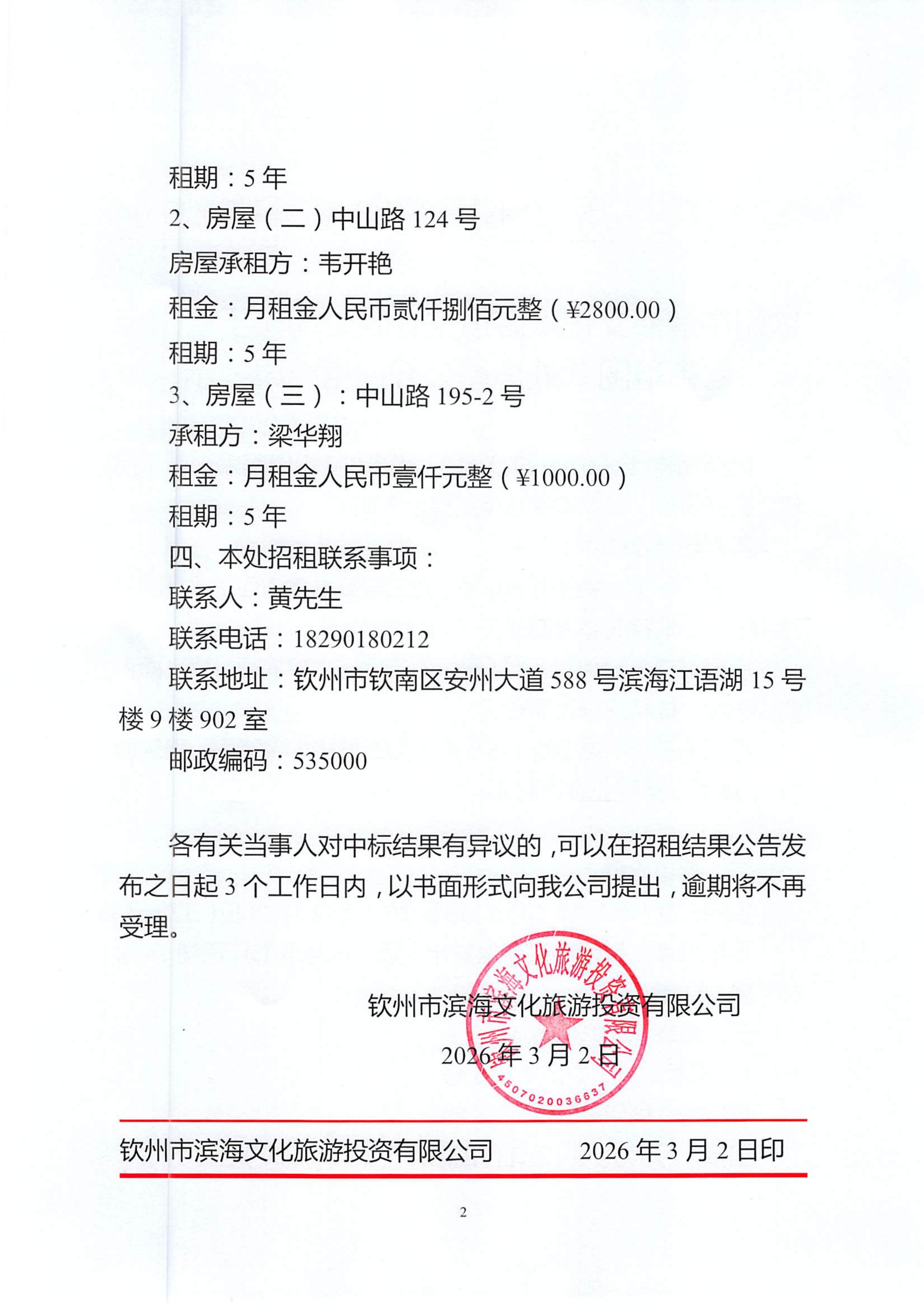 欽州市濱海文化旅游投資有限公司關于欽州市老街范圍3處房屋公開招租結果公示