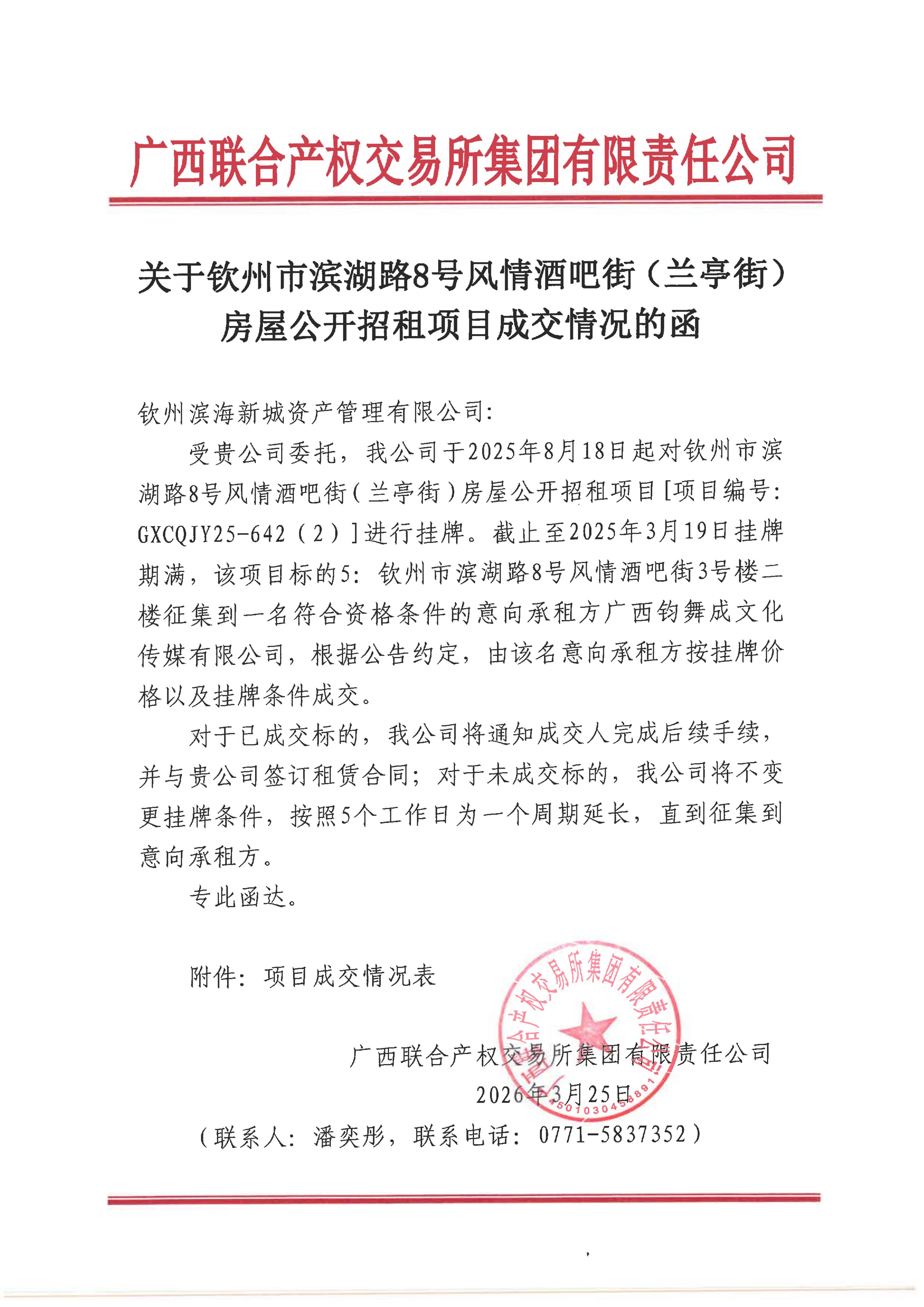 關于欽州市濱湖路8號風情酒吧街(蘭亭街)房屋公開招租項目成交情況的函(第四期)
