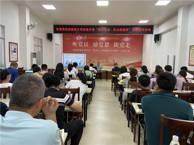 2021年6月28日,集團公司黨委組織黨員干部到文昌社區開展“美好生活·民法典相伴”主題宣傳活動。并在文昌社區新時代文明實踐大課堂舉辦了一場《中華人民共和國民法典》宣傳宣講。