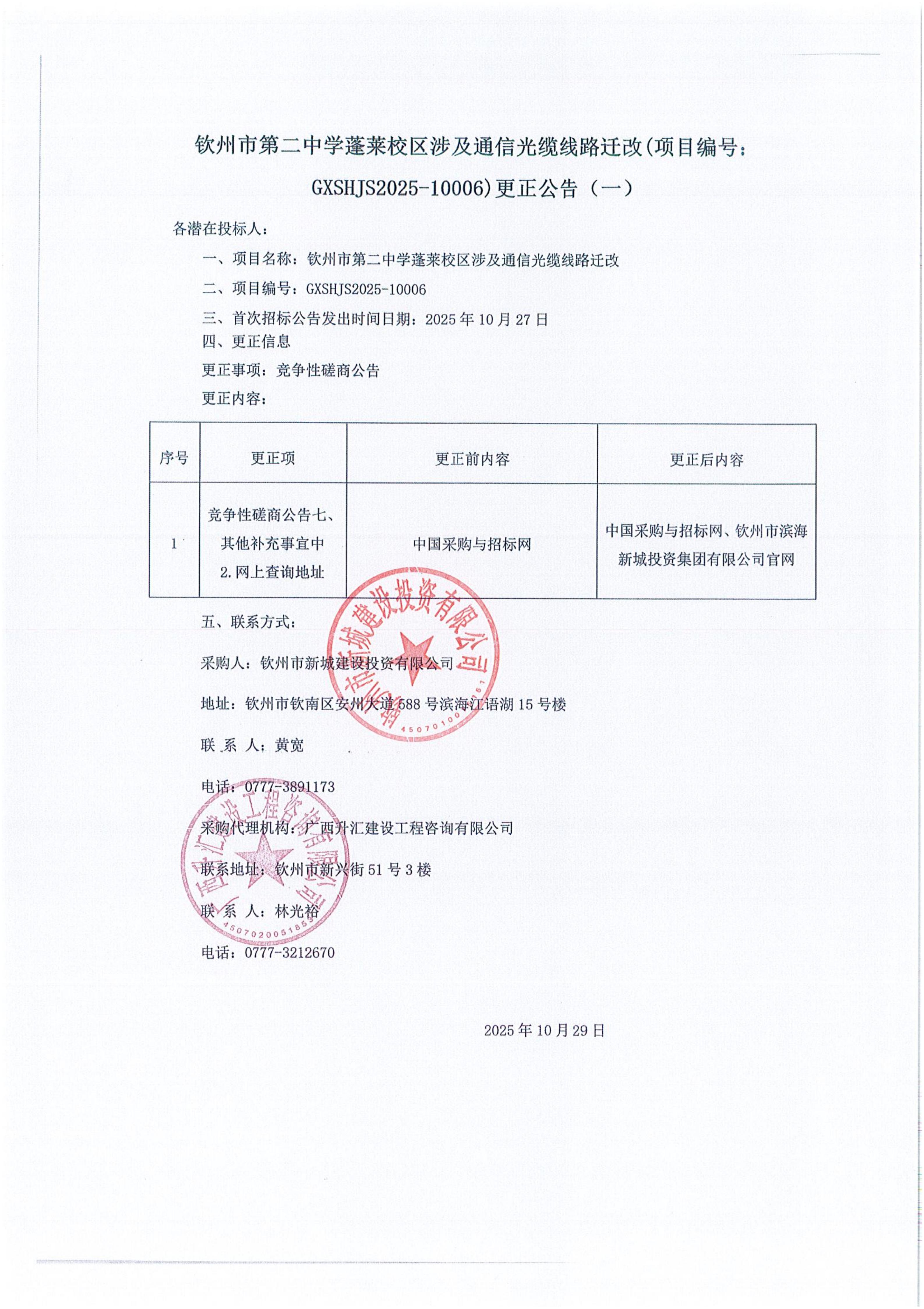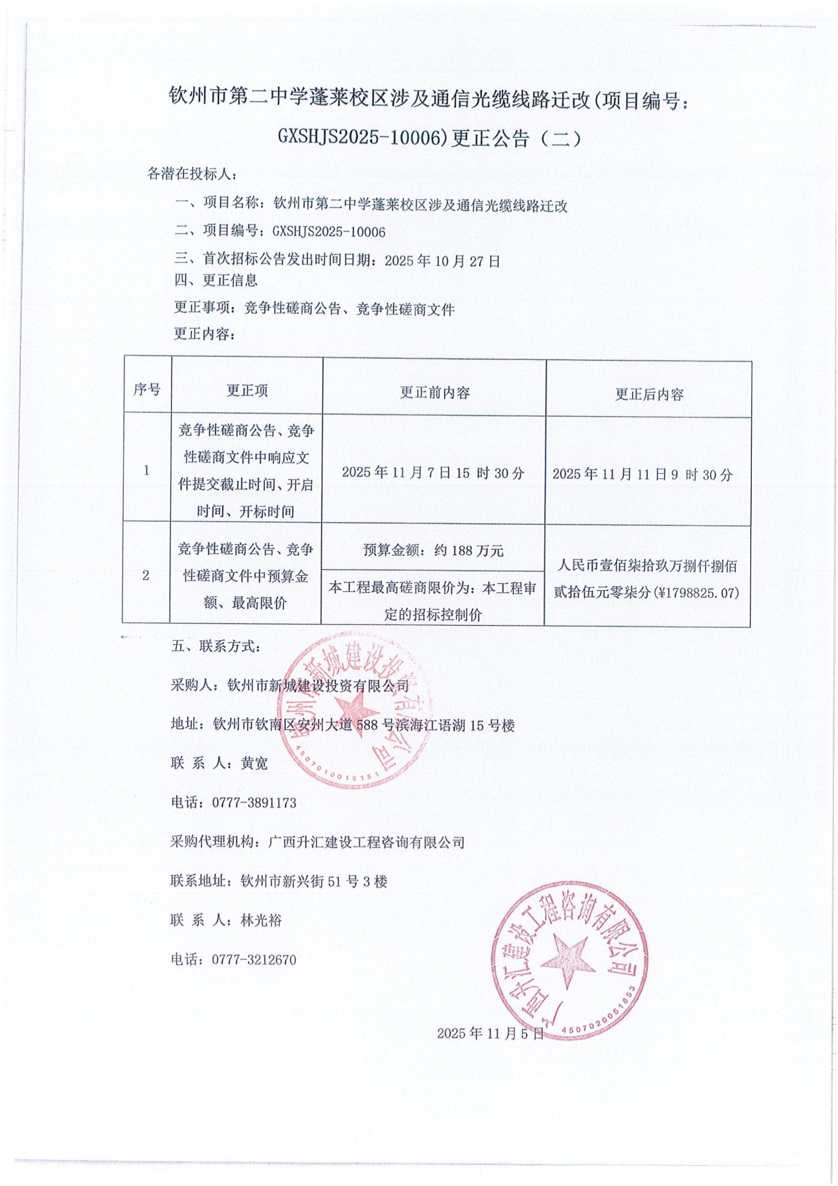 欽州市第二中學(xué)蓬萊校區(qū)涉及通信光纜線路遷改(項目編號: GXSHJS2025-10006)更正公告(一)