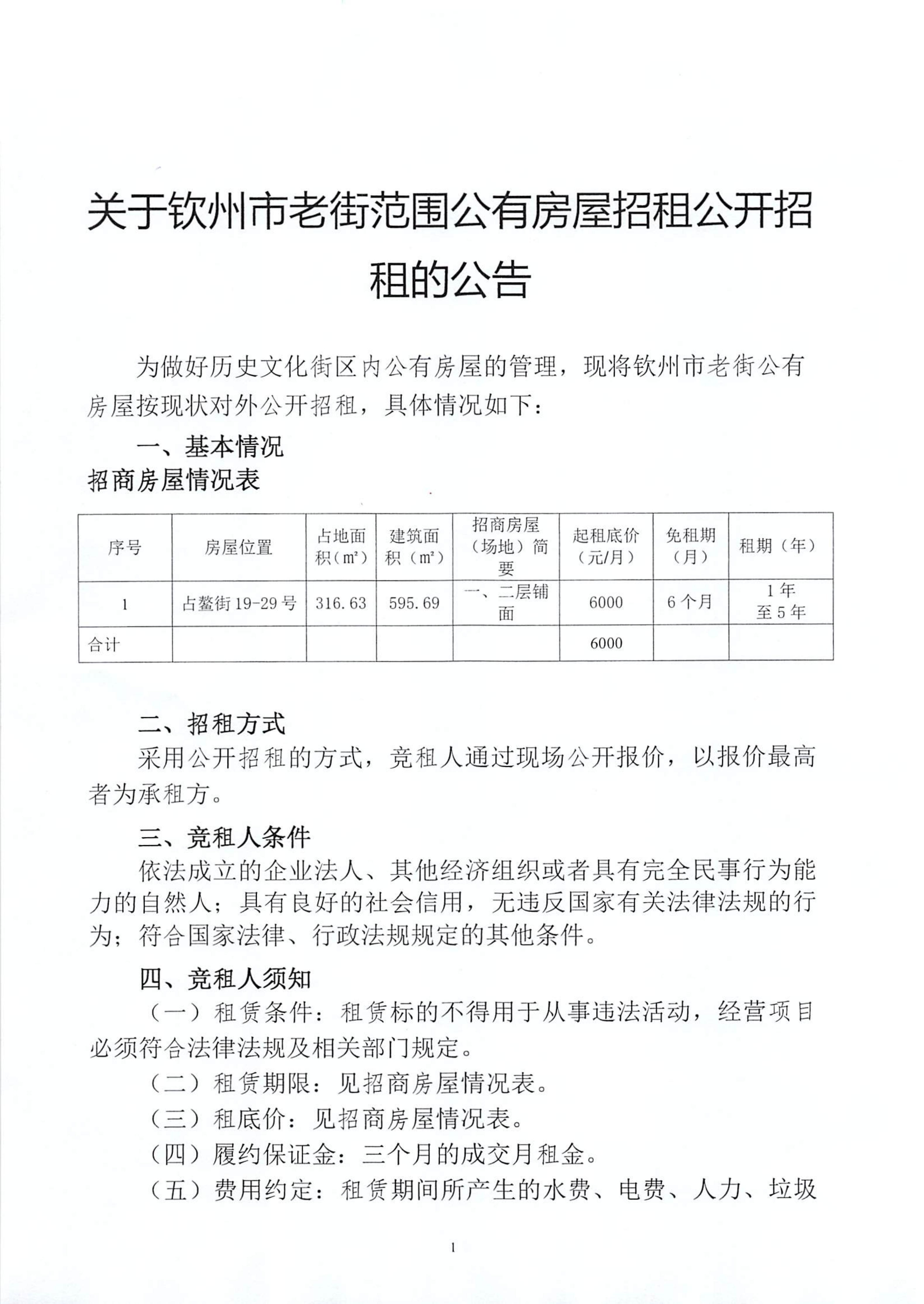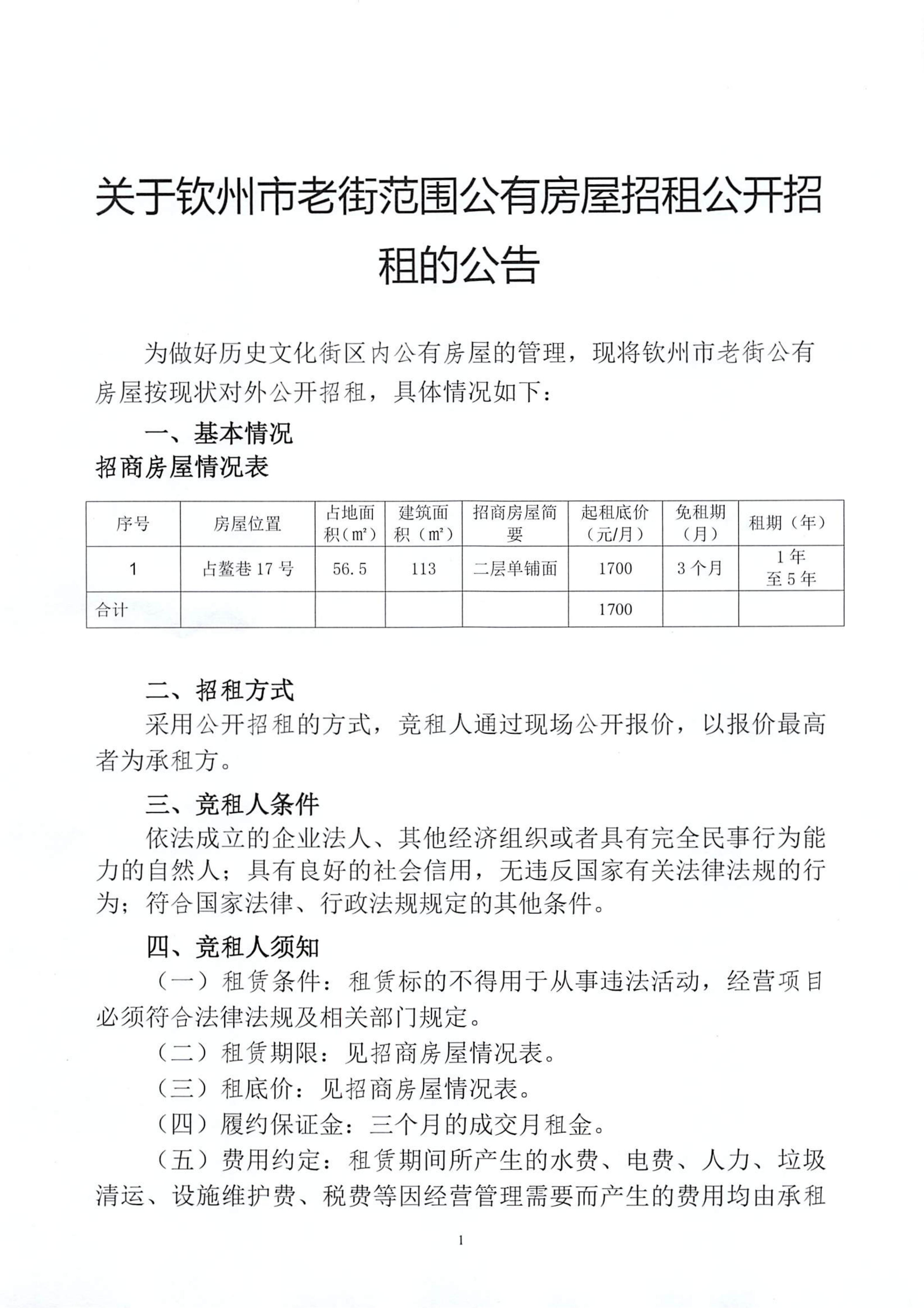 關(guān)于欽州市老街范圍公有房屋招租公開招租的公告(占鰲巷67號)