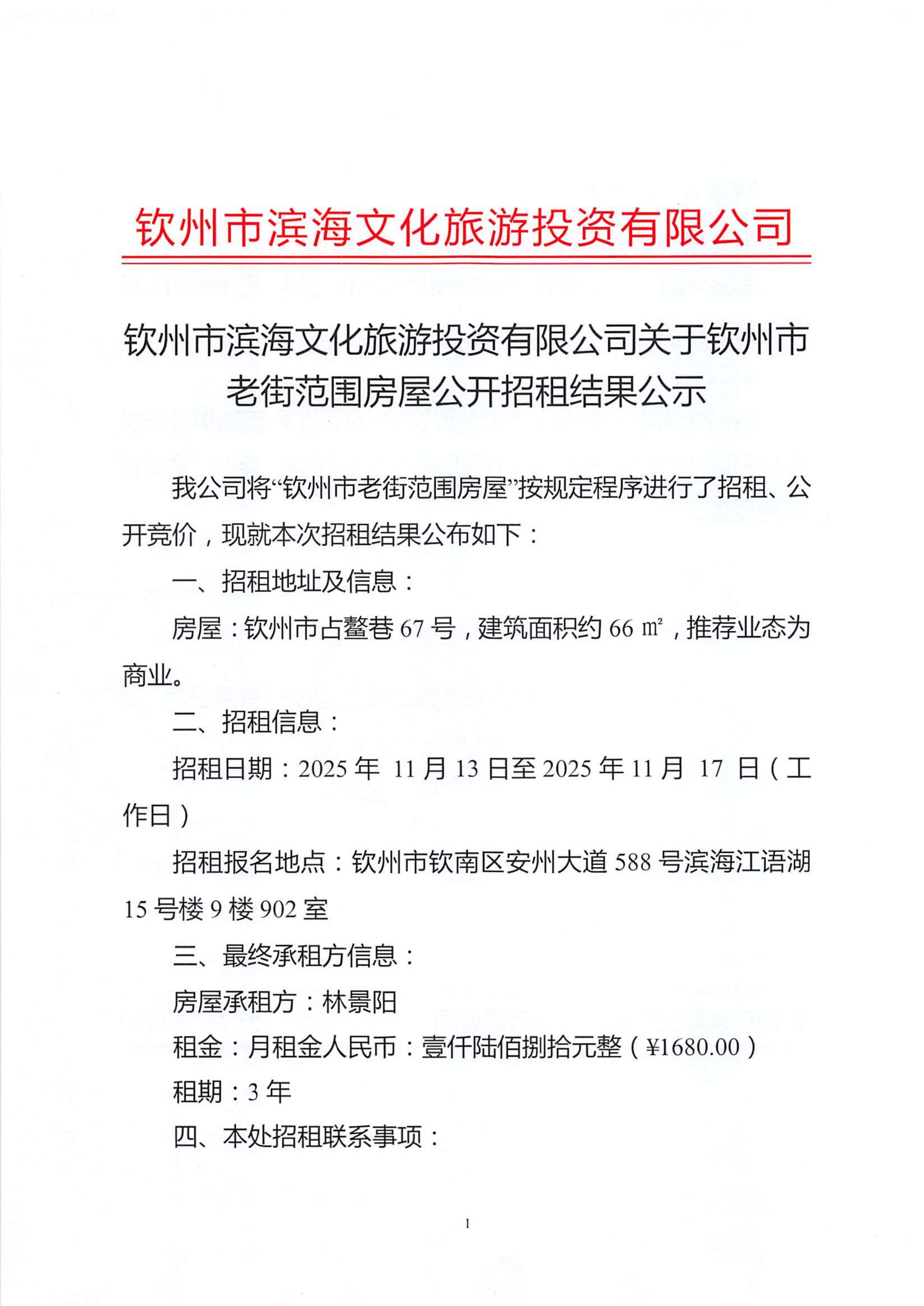 關(guān)于欽州市老街范圍房屋公開招租結(jié)果公示(欽州市占鰲巷67號)