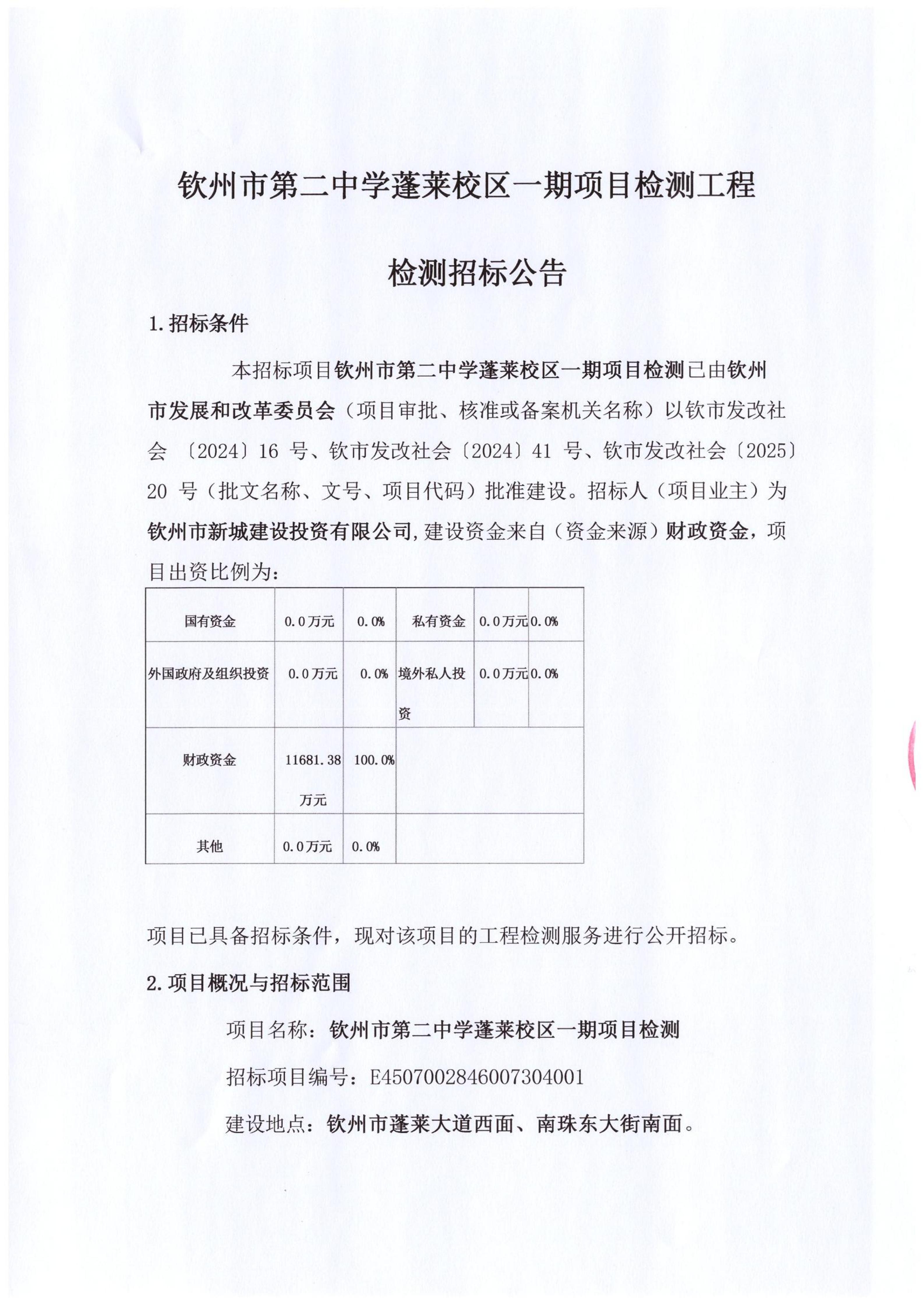 欽州市第二中學(xué)蓬萊校區(qū)一期項目檢測工程檢測招標(biāo)公告