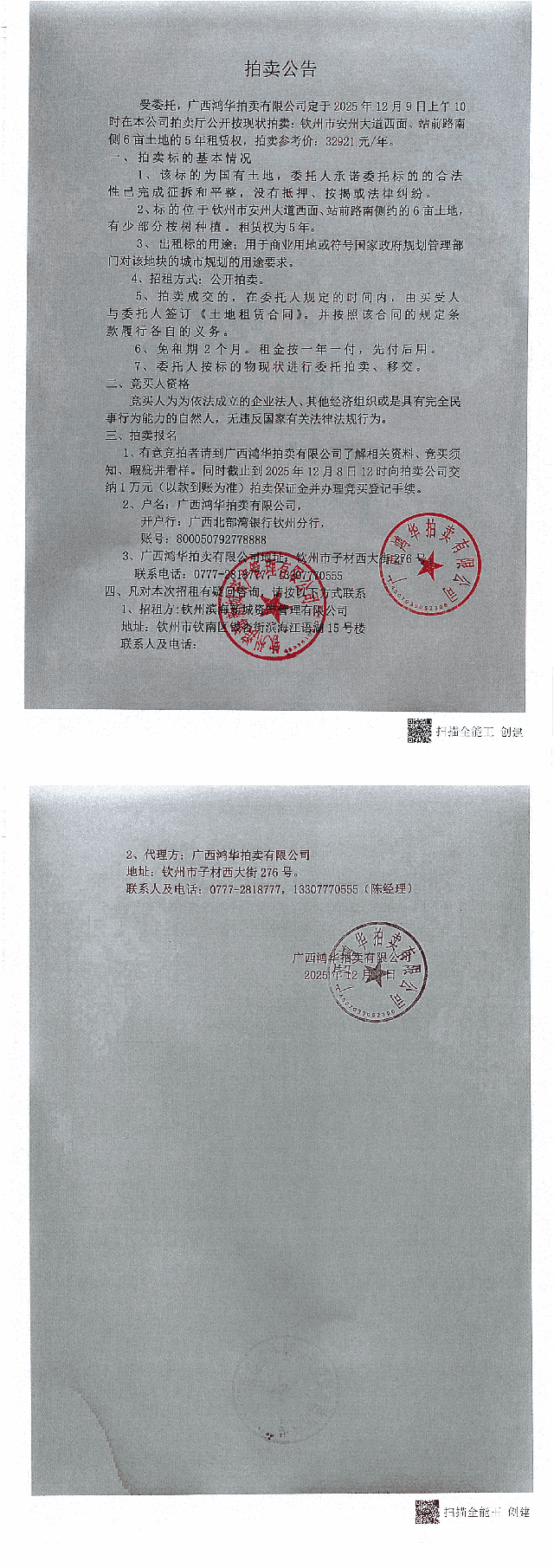 拍賣公告(欽州市安州大道西面、站前路南側6畝土地的5年租賃權)