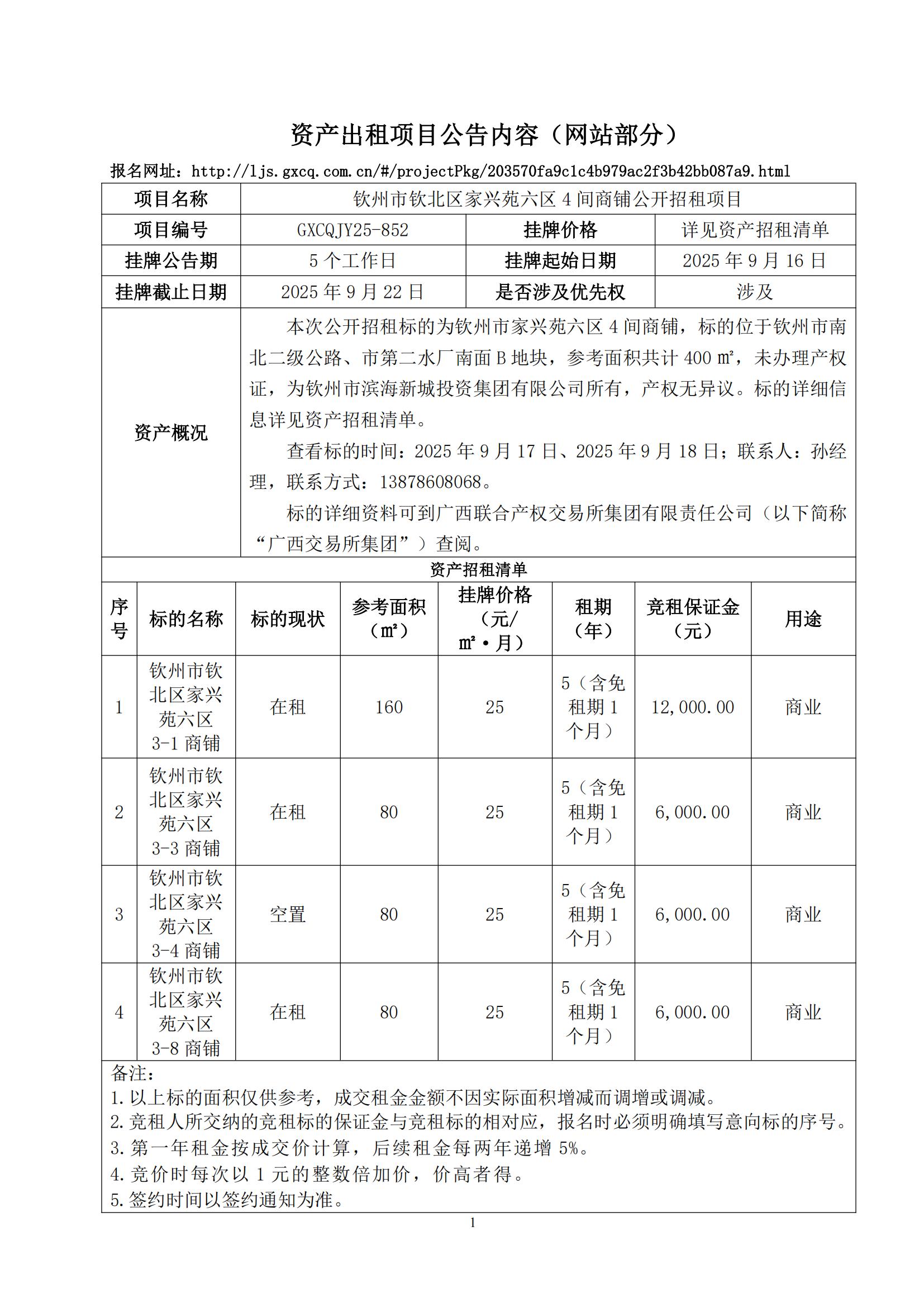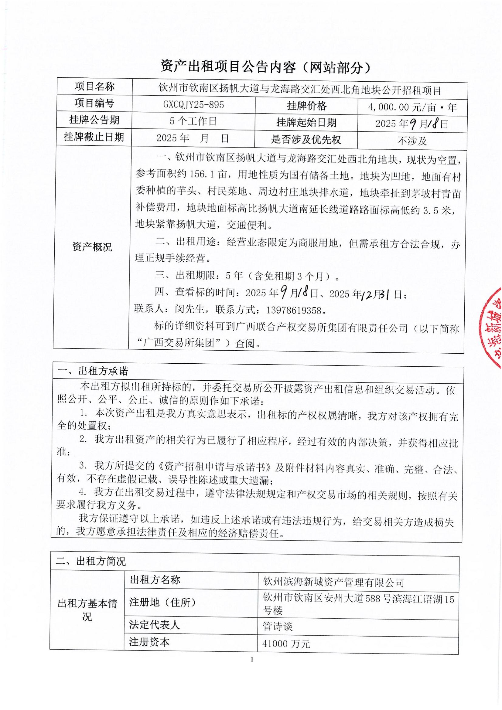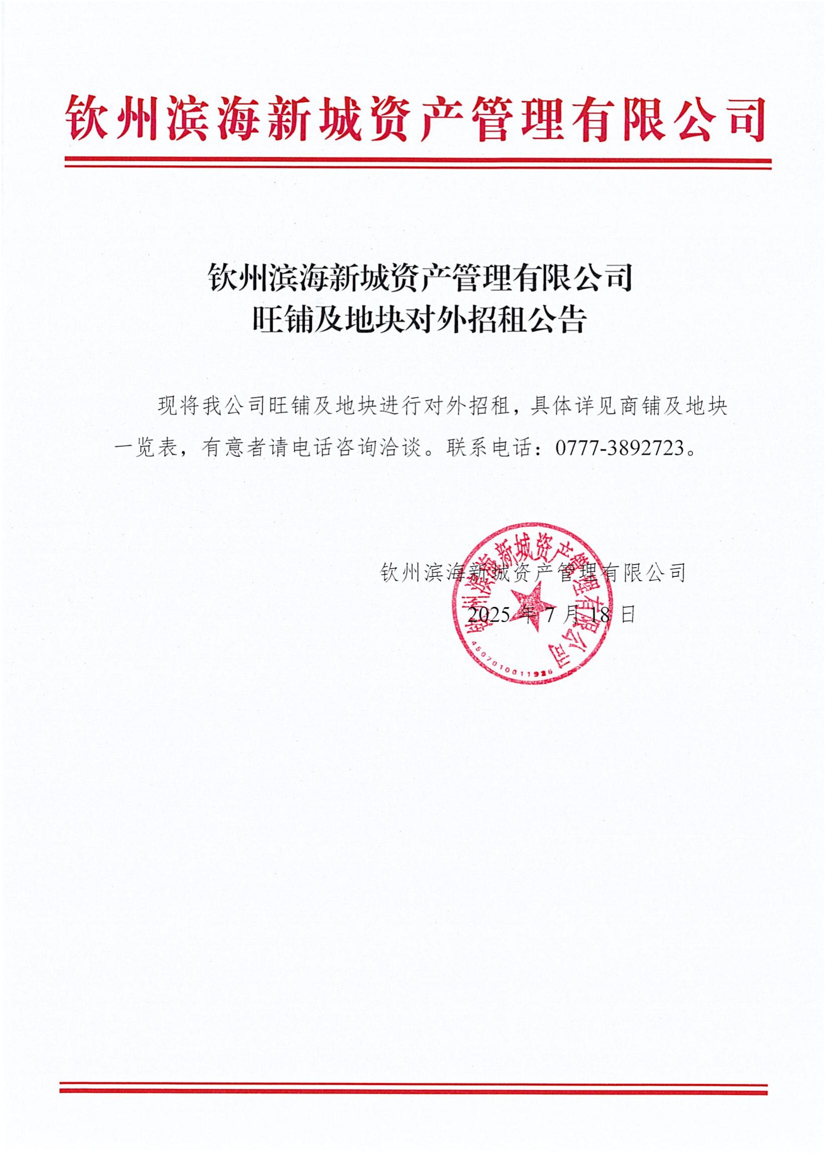 欽州濱海新城資產管理有限公司旺鋪及地塊對外招租公告