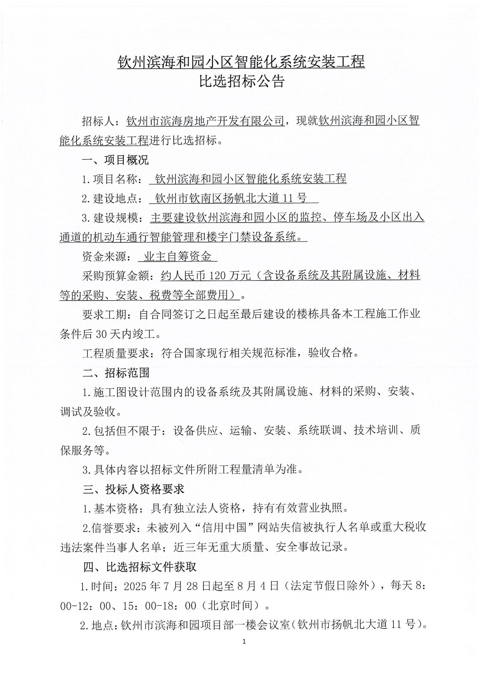 欽州濱海和園小區智能化系統安裝工程比選招標公告