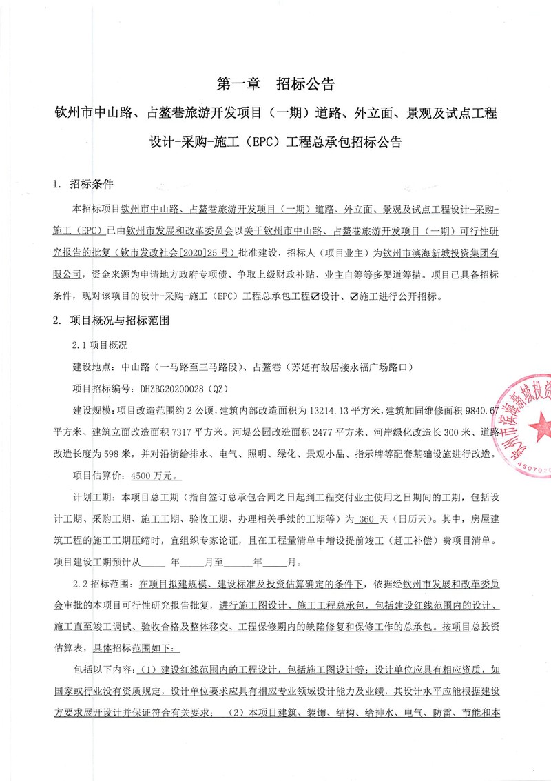 欽州市中山路、占鰲巷旅游開(kāi)發(fā)項(xiàng)目(一期)道路、外立面、景觀及試點(diǎn)工程設(shè)計(jì)-采購(gòu)-施工(EPC)工程總承包招標(biāo)公告