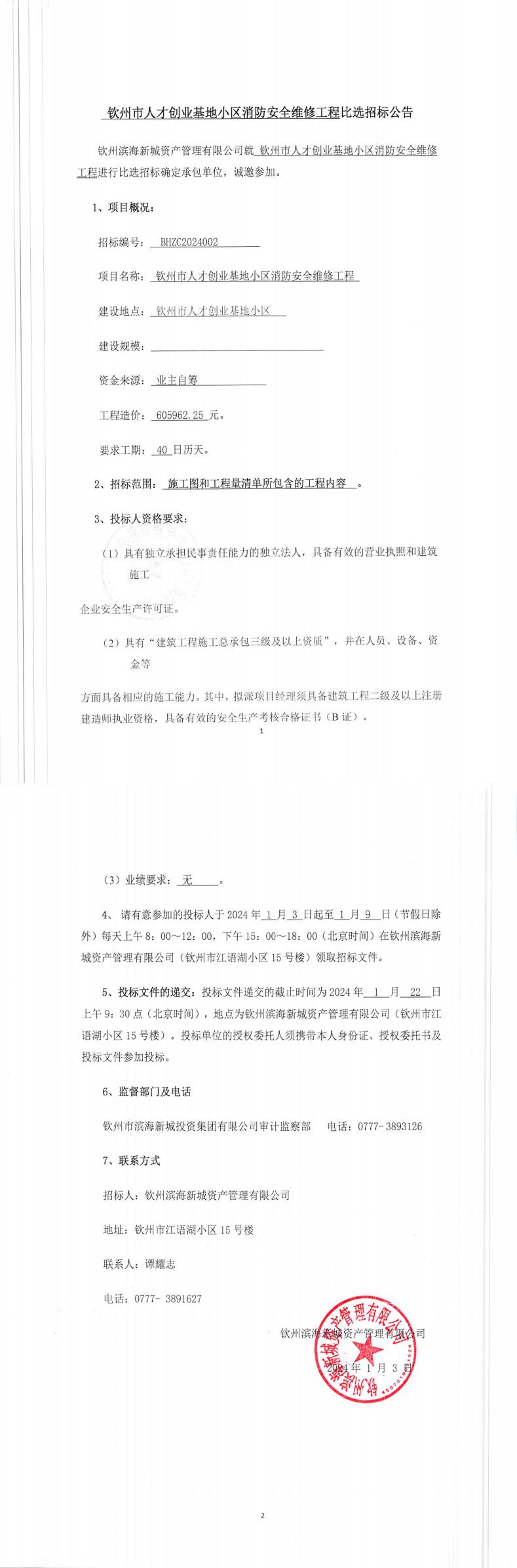 欽州市人才創業基地小區消防安全維修工程比選招標公告